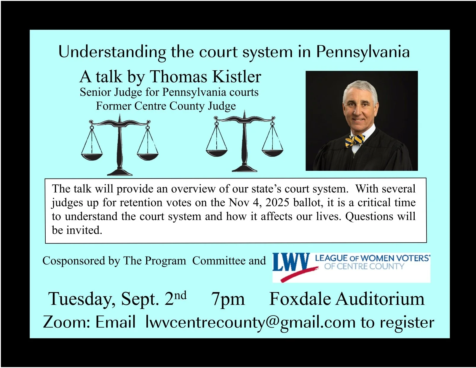 A recent talk by Thomas Kistler, Senior Judge for PA Courts, former Centre County Judge, hosted by the LWVCC. The talk provided an overview of our state's court system. With several judges up for retention votes on the Nov 4, 2025 ballot, it is a critical time to understand the court system and how it affects our lives!